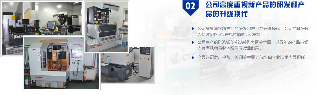公司現(xiàn)有員工中,專(zhuān)業(yè)技術(shù)人員占50%以上,產(chǎn)品的研發(fā)、檢驗(yàn)、檢測(cè)等主要崗位均由專(zhuān)業(yè)技術(shù)人員擔(dān)任。 公司高度重視新產(chǎn)品的研發(fā)和產(chǎn)品的升級(jí)換代,公司的科研投入持續(xù)5年保持在總產(chǎn)值的5%左右,確保企業(yè)的產(chǎn)品品質(zhì)和檔次處于行業(yè)主流地位。 公司生產(chǎn)的POWER-420系列高頻手術(shù)器,近五年的產(chǎn)品市場(chǎng)占有率及銷(xiāo)售收入穩(wěn)居同行業(yè)前茅。 公司還推出了ATS-Ⅰ型單回路和雙回路自動(dòng)氣壓止血帶;婦科LEEP手術(shù)系統(tǒng).....詳情
